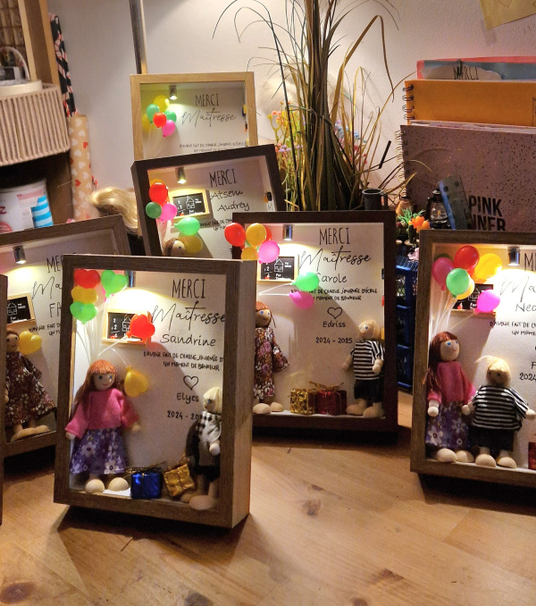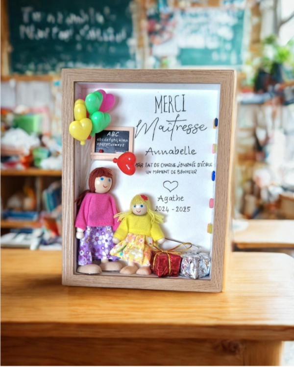 Offrez à la maîtresse de votre enfant un cadeau personnalisé et artisanal, entièrement façonné à la main avec des matières naturelles et des poupées en bois créées selon votre demande.