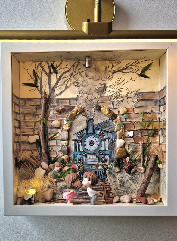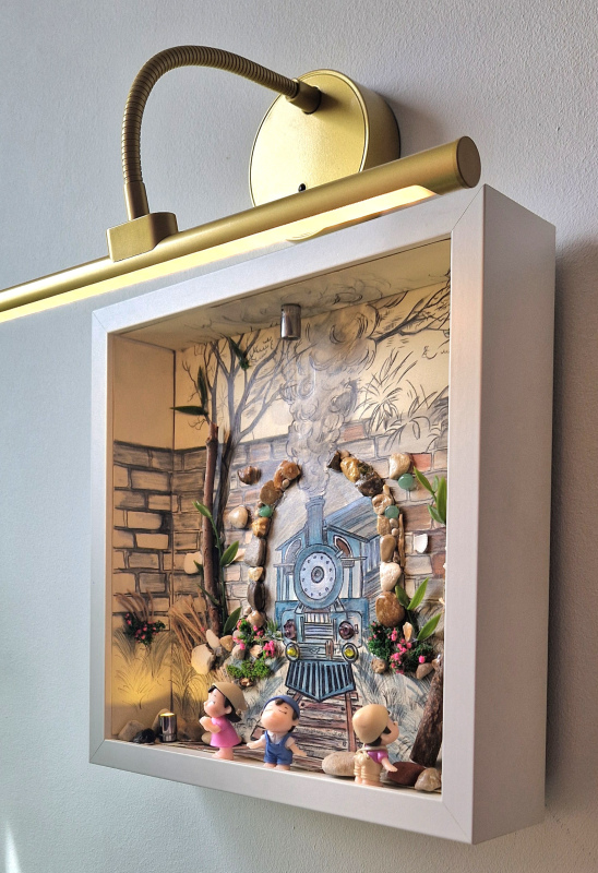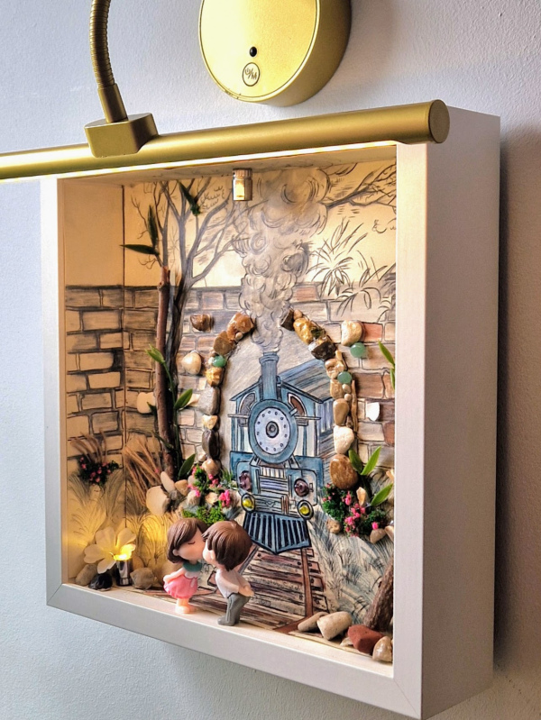 L'éclairage intégré, subtilement placé au-dessus de la boîte, met en valeur chaque élément, créant des jeux d'ombres et de lumières qui animent la scène. Parfaite pour les amateurs de trains, les rêveurs, ou ceux qui cherchent une pièce d'art unique pour leur salon, chambre ou bureau.