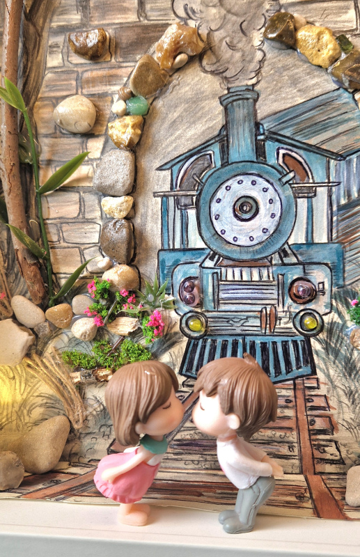 Cette œuvre délicatement fait main capture une scène ferroviaire onirique où une locomotive à vapeur émerge d'un tunnel de pierres, encadrée par une nature luxuriante.