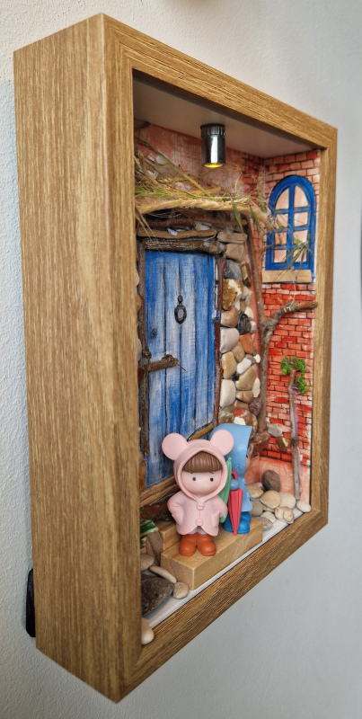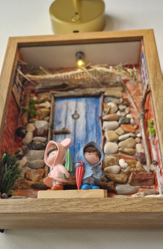 Un diorama fait main où deux enfants, parapluie à la main, attendent devant une porte bleue au charme rustique.