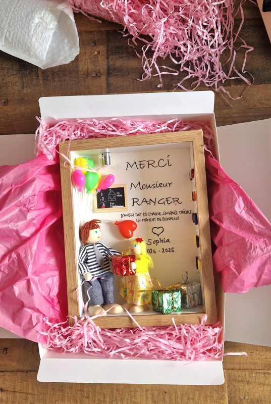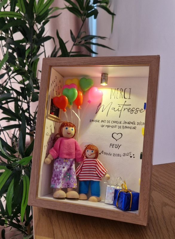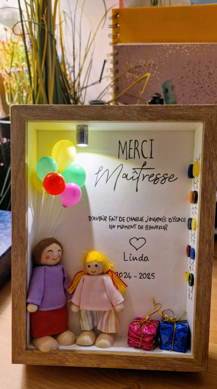 Offrez à la maîtresse de votre enfant un cadeau personnalisé et artisanal, entièrement façonné à la main avec des matières naturelles et des poupées en bois créées selon votre demande.