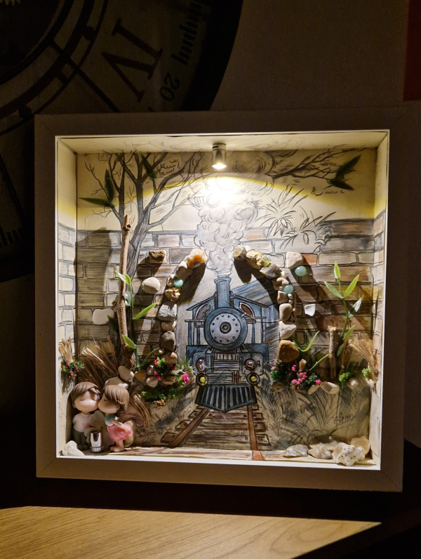 L'éclairage intégré, subtilement placé au-dessus de la boîte, met en valeur chaque élément, créant des jeux d'ombres et de lumières qui animent la scène. Parfaite pour les amateurs de trains, les rêveurs, ou ceux qui cherchent une pièce d'art unique pour leur salon, chambre ou bureau.
